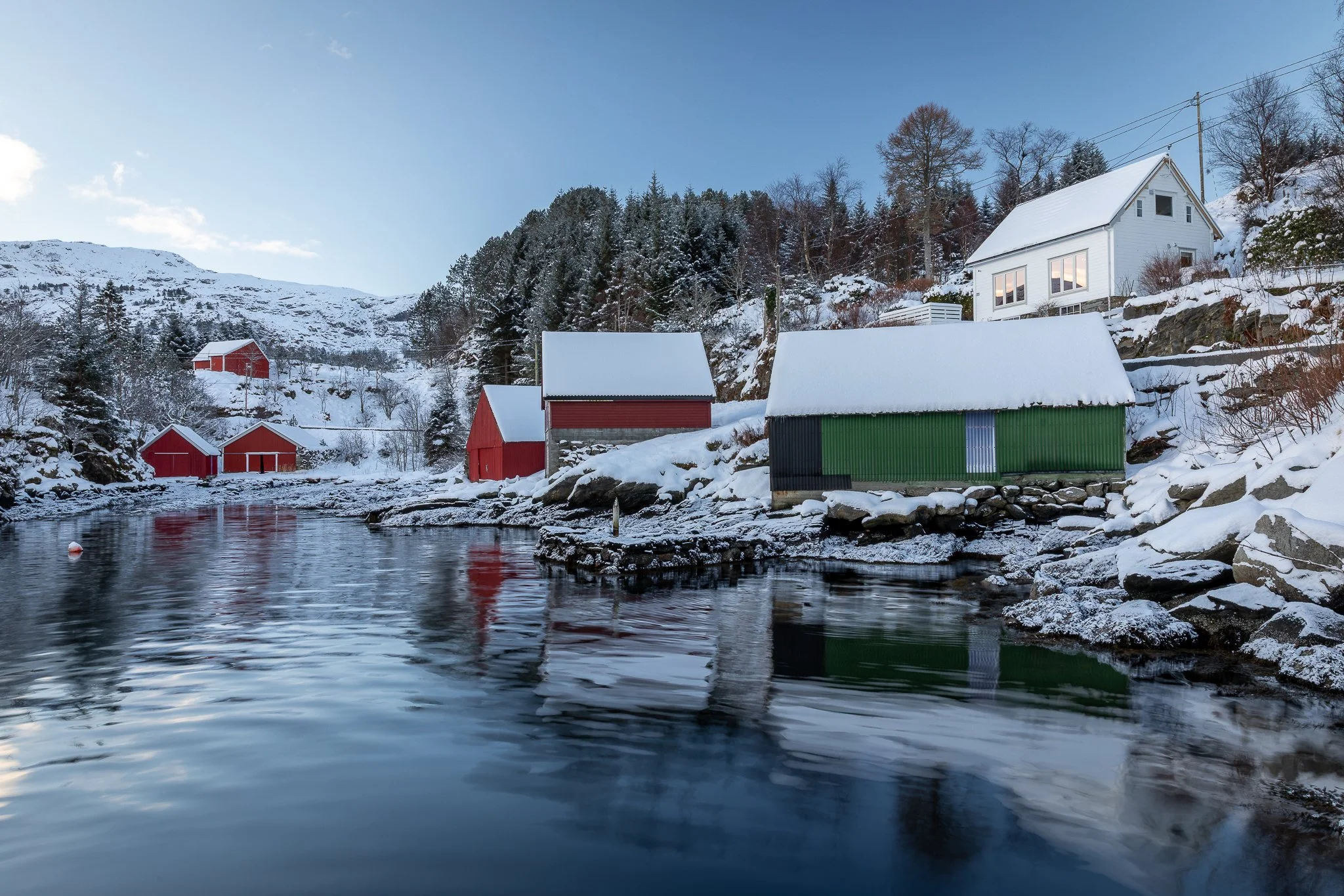 The main settlement on the island is the village of Husevåg, tucked into a sheltered bay on the north-west side of Husevågøy. Today it is a quiet community with only a small number of permanent residents, but the shoreline still tells the story of busier times: old wooden boathouses, small sheds, slipways and piers show how closely everyday life was tied to fishing and boat traffic along the Norwegian coast.