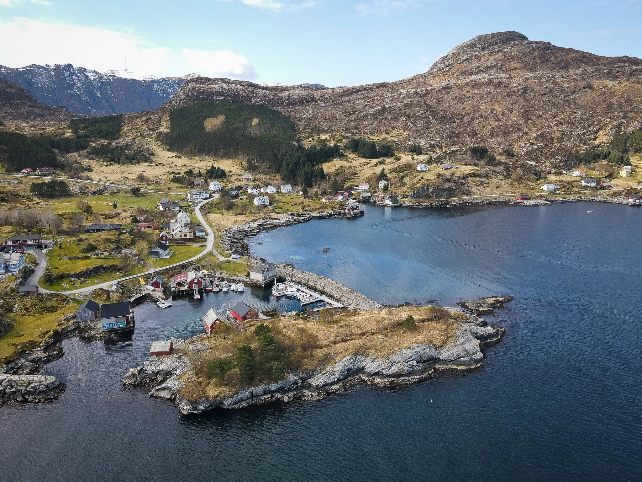 A drone view of Husevåg with the breakwater and harbour in the foreground. See also the drone video for more aerial views of the village and the surrounding coastline.