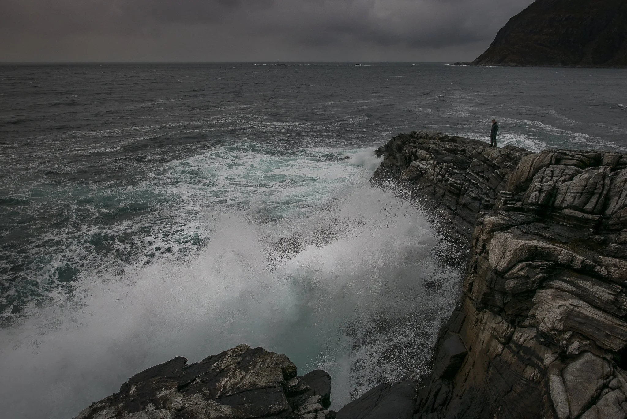 Stormy day at Husevåg, when waves from the Stad sea crash heavily against the cliffs. On the most weather-beaten days it is impossible to get all the way out here – see also the storm video from Kråkenes lighthouse just north of Husevågøy.