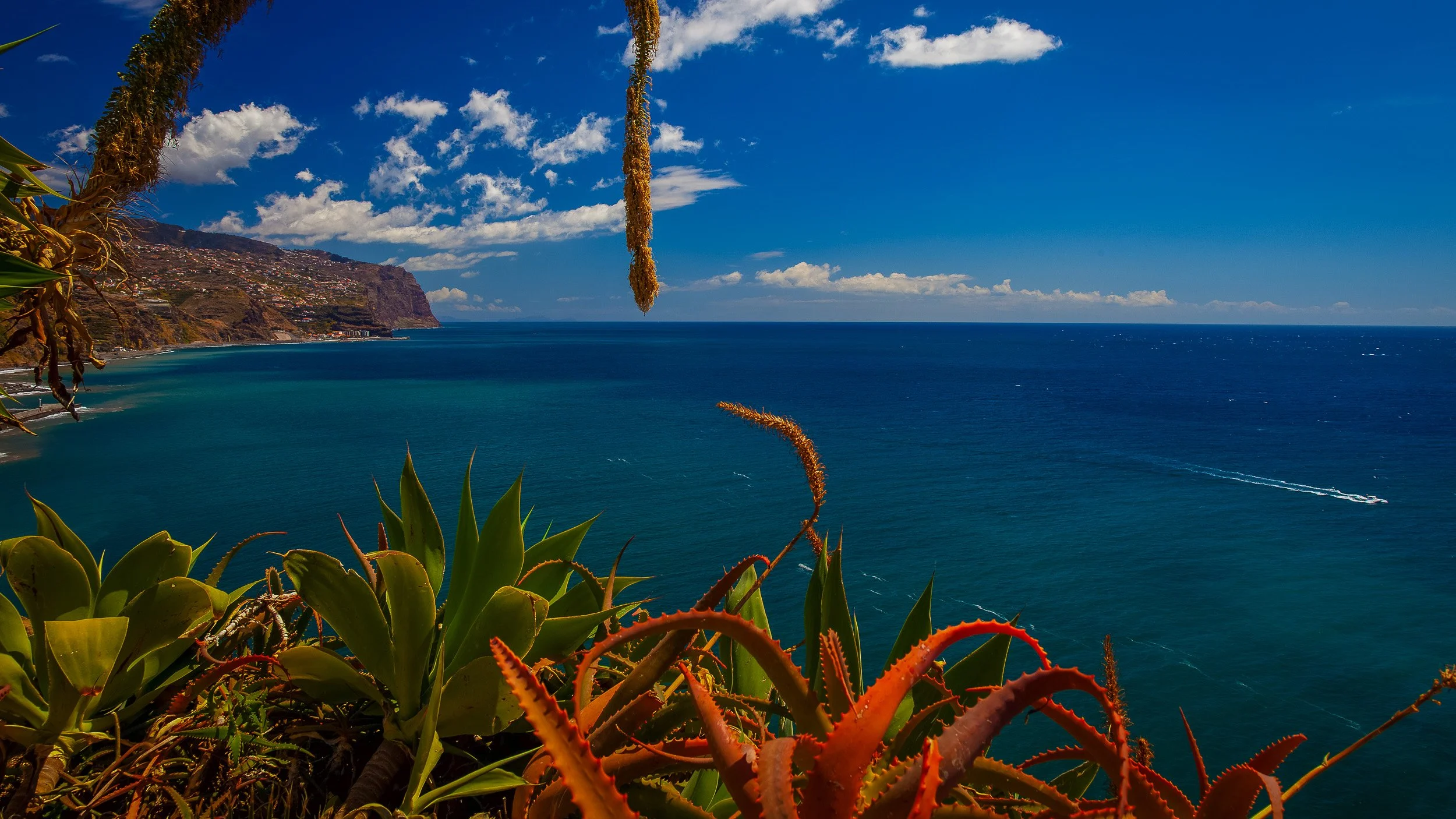 Aloe and agave plants frame a wide Atlantic view near Ponta do Sol, with Madeira’s coastline fading into blue water and bright island light.